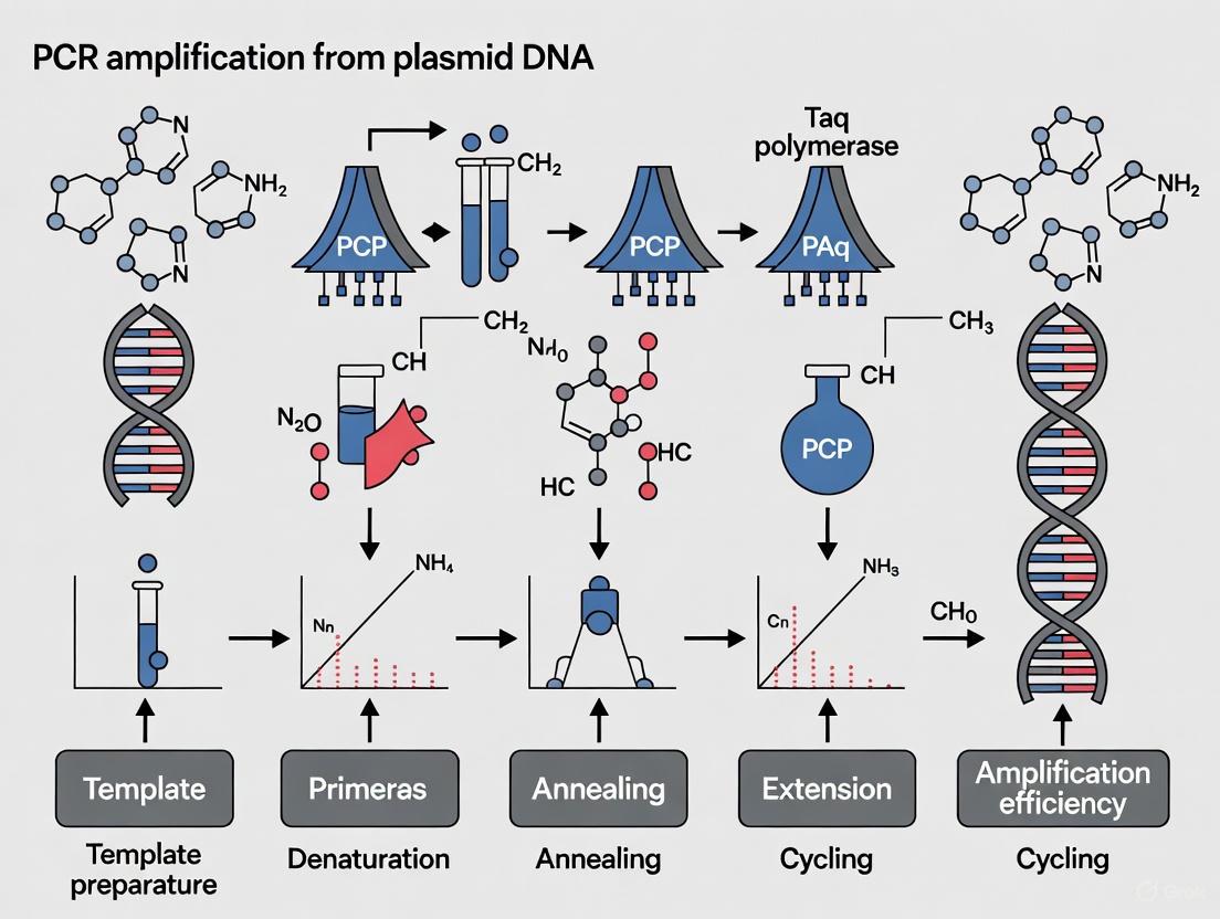 In the context of polymerase chain reaction (PCR) amplification from plasmid DNA, the quality, quantity, and complexity of the template DNA are fundamental determinants of experimental success. These parameters directly influence the sensitivity, efficiency, and specificity of amplification reactions, thereby impacting the reliability of results in research and drug development applications. Optimal template DNA characteristics ensure efficient primer binding and polymerase activity while minimizing nonspecific amplification and artifacts. This application note provides a comprehensive framework for the preparation and quantification of plasmid DNA templates, establishing guidelines that support reproducible and robust PCR outcomes in molecular biology workflows. Understanding these principles is essential for researchers designing protocols for gene cloning, mutagenesis, and expression vector construction where plasmid DNA serves as the primary template material.