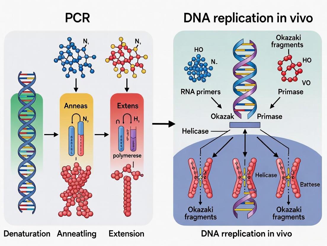 At the highest level, in vivo DNA replication is a biological process of producing two identical replicas of an entire genome from one original DNA molecule, occurring inside living cells [3]. In contrast, PCR is a laboratory process used to make millions of copies of a specific, targeted DNA fragment outside of a living organism (in a test tube) [3]. The following table summarizes the fundamental distinctions between these two systems.